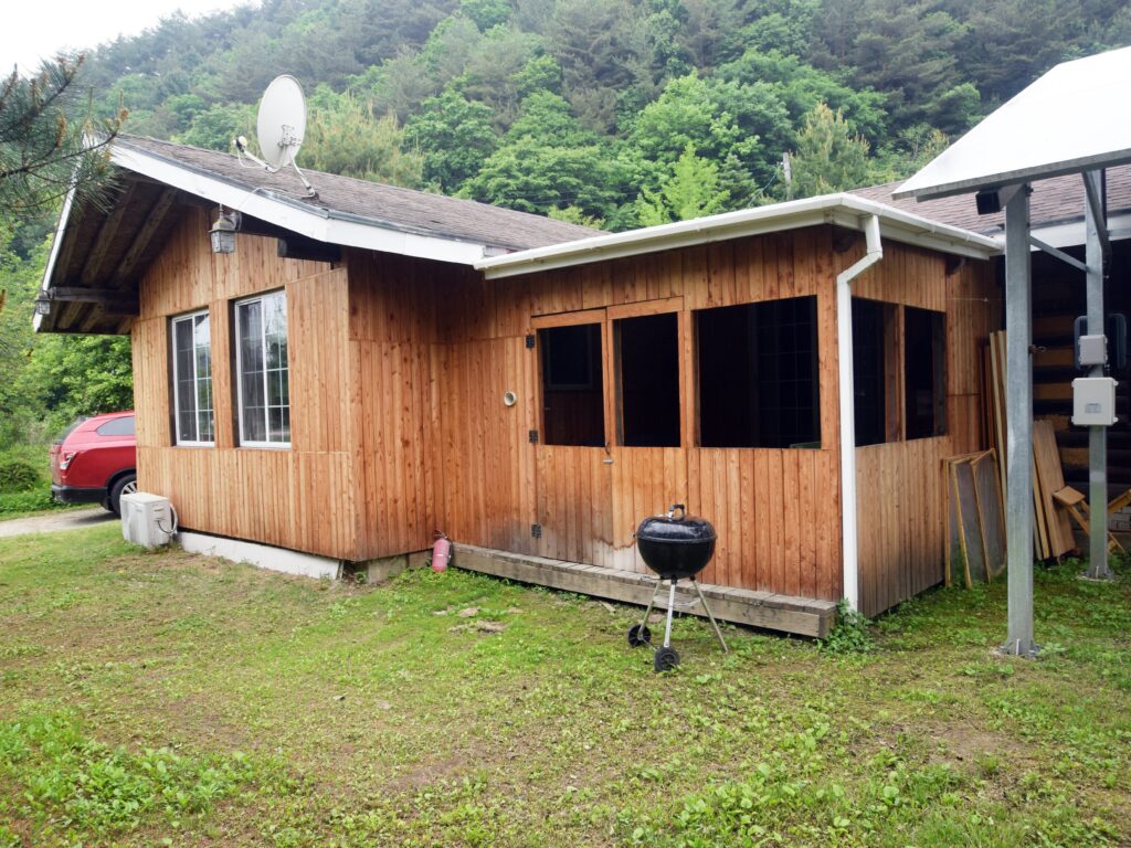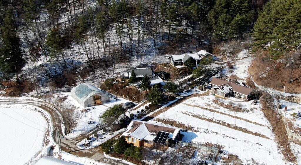황토벽돌과 한국 통나무로 지어진 귀틀 흙집으로 집의 90%가 황토와 나무입니다.